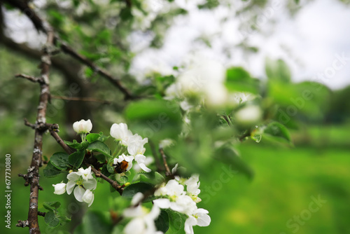 White flowers on a green bush. Spring cherry apple blossom. The white rose is blooming.