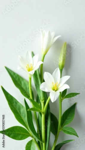 White flowers with leaves isolated on gray-white background, greenery, herb, garden