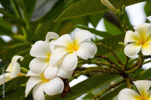 White Frangipani flower Plumeria alba with green leaves