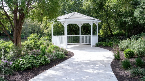 White gazebo garden path, tranquil park scene, wedding backdrop