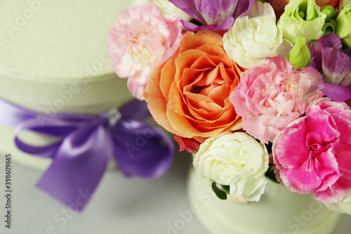 White gift box decorated purple ribbon and bouquet of beautiful flowers. Wedding gift. Birthday gift. Valentine gift. Mothers Day gift. Greeting card template.
