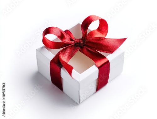 gift, box, red, ribbon, white, present, surprise, bow, satin, giving, holiday, celebration, birthday, anniversary, love, event, open, empty, square, package, container, festive, elegant, occasion, wrapping, design, art, still life, studio, nobody, isolated, minimalist, simple, bright, clean, shadow, soft, texture, detail, object, background, blank, space, copy, decoration, decorative, craft, hand-made, homemade