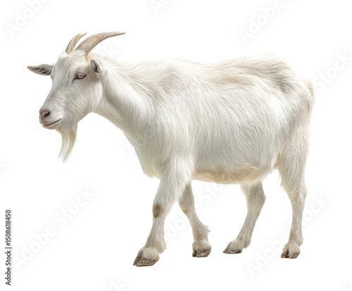 White goat standing on grassy terrain near a farm on a transparent background, cut out
