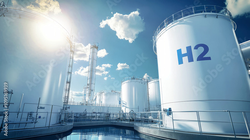 hydrogen, storage, tank, energy, industry, production, plant, clean, modern, technology, renewable, resource, industrial, site, blue, sky, sun, photorealistic, environmental, sustainability, futuristic, design, management, sunlight, engineering, green, infrastructure, atmospheric, capture, natural, light, efficiency, innovation, chemical, fuel, machinery, architecture, system, technically, advancement, solution, ecological, development, power