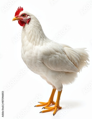 White hen stands isolated on a clean white background. This domestic poultry bird has bright red comb and wattle, yellow beak, and orange legs with sharp claws. Its feathers are clean and white.