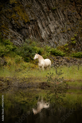 horse, pony, connemara, mountain, basalt, rock, lake, nature, white, landscape, mountain, animal, german, stone