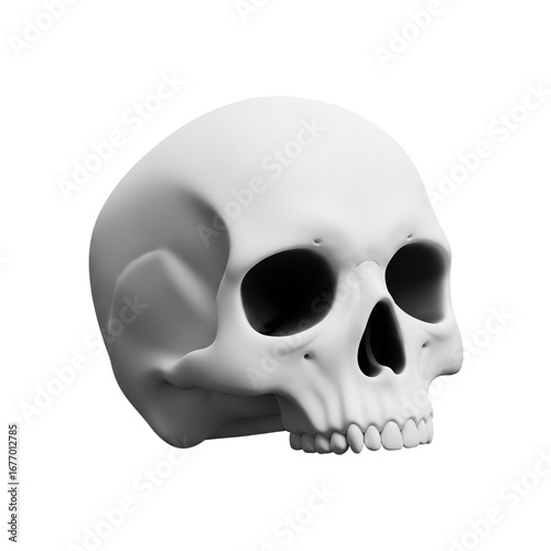 White human skull model in three quarter view.