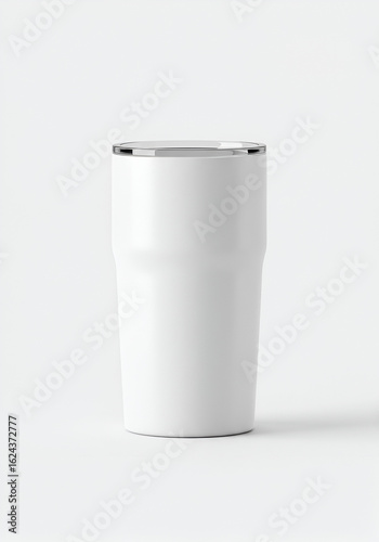white, insulated, tumbler, stainless, steel, cup, container, metal, lid, silver, band, empty, clean, modern, product, studio, shot, blank, isolated, photographic, design, branding, presentation, display, image, commercial, cardboard box, promotion, marketing, advertising, high, quality, photo, geometric, shape, rounded, light, background, visual