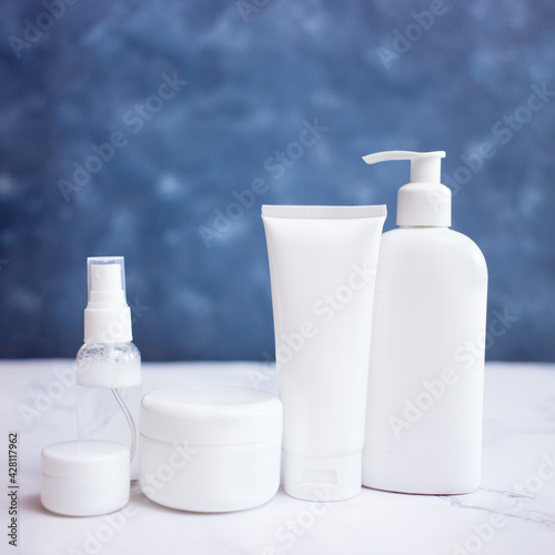 White jars of cosmetics on a blue pastel background. Bath accessories. Face and body care concept. Copy space