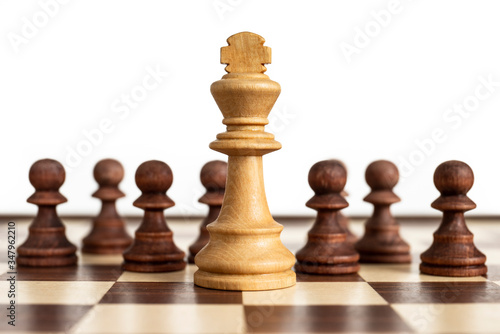 White king surrounded by black pawns. Concept picture taken in studio concerning decision making, strategy, challenge and conflict.