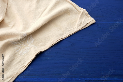 white kitchen textile towel folded on a blue wooden table from boards