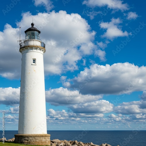 lighthouse, sky, cloud, ocean, sea, coast, white, tall, tower, blue, summer, daytime, sunny, bright, landscape, nature, travel, seascape, horizon, calm, peaceful, serene, navigation, maritime, beacon, guidance, structure, architecture, stone, rock, coastal, water, cloudscape, scenic, view, image, photo, photo, picture, visual, graphic, media