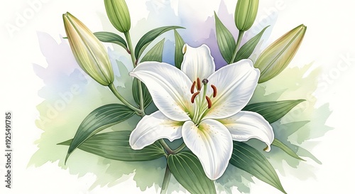 lily, white lily, flower, floral, blossom, bloom, plant, nature, botanical, watercolor, painting, illustration, decorative, elegant, beautiful, design, isolated, background, spring, summer, beauty, flora, leaf, green, freshness, vector, easter, invitation, card