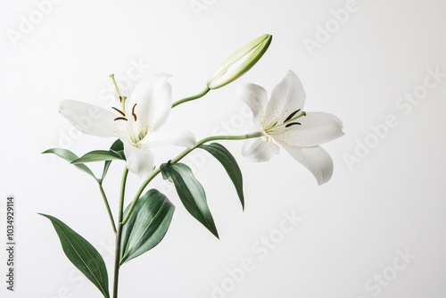 White Lily Flowers with Green Stems Against a White Background