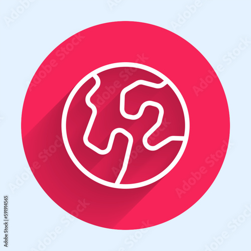 White line Earth globe icon isolated with long shadow background. World or Earth sign. Global internet symbol. Geometric shapes. Red circle button. Vector