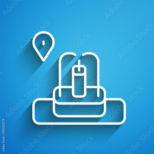 White line Location with fountain icon isolated on blue background. Long shadow. Vector