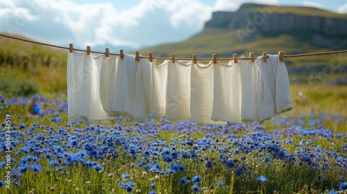 White linens are drying on a clothesline amidst a field of blue flowers with a visible sky and distant hills.