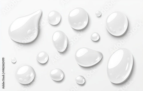 White liquid drops, various shapes and sizes, on a white surface. Detailed, realistic representation of water droplets