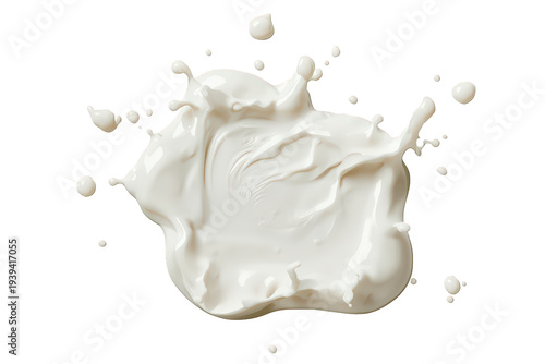 White liquid splashing with drops in motion on a transparent background, symbolizing dairy, health, and refreshment