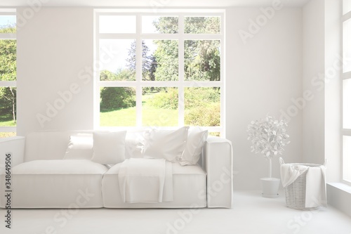 White living room with sofa and summer landscape in window. Scandinavian interior design. 3D illustration