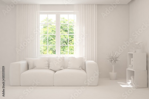 White living room with sofa and summer landscape in window. Scandinavian interior design. 3D illustration