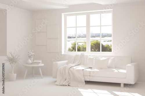 White living room with sofa and summer landscape in window. Scandinavian interior design. 3D illustration