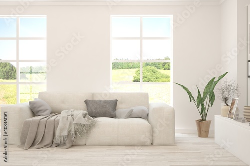 White living room with sofa and summer landscape in window. Scandinavian interior design. 3D illustration