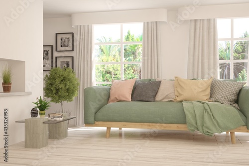 White living room with sofa and summer landscape in window. Scandinavian interior design. 3D illustration