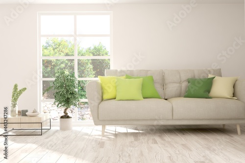 White living room with sofa and summer landscape in window. Scandinavian interior design. 3D illustration