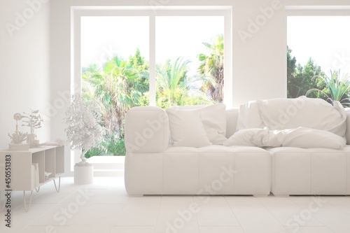 White living room with sofa and summer landscape in window. Scandinavian interior design. 3D illustration