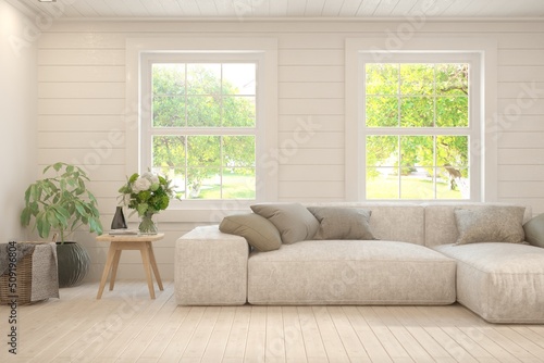 White living room with sofa and summer landscape in window. Scandinavian interior design. 3D illustration