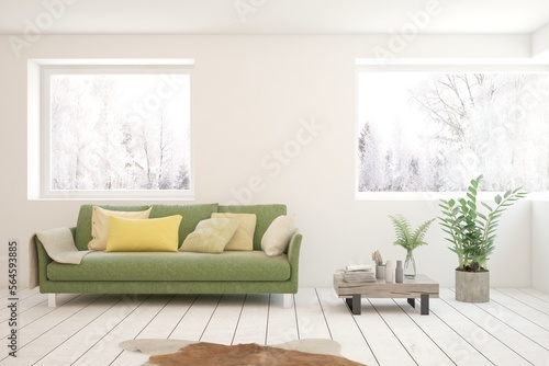 White living room with sofa and winter landscape in window. Scandinavian interior design. 3D illustration
