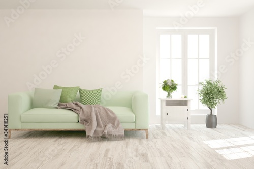 White living room with sofa. Scandinavian interior design. 3D illustration