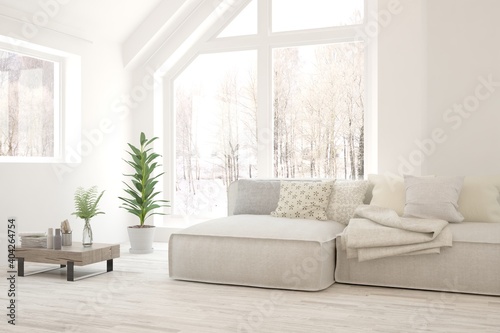 White living room with sofa. Scandinavian interior design. 3D illustration