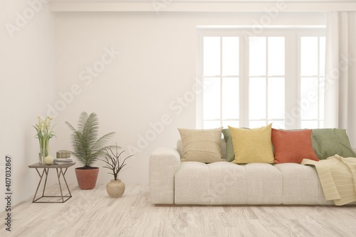 White living room with sofa. Scandinavian interior design. 3D illustration