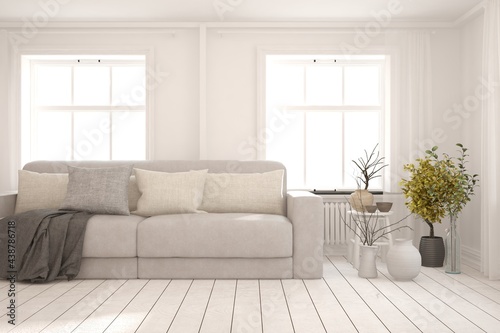 White living room with sofa. Scandinavian interior design. 3D illustration