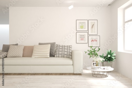 White living room with sofa. Scandinavian interior design. 3D illustration