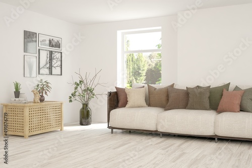 White living room with sofa. Scandinavian interior design. 3D illustration