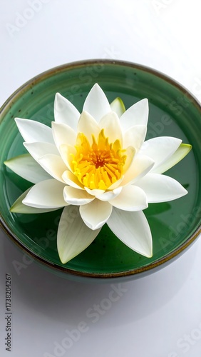 lotus, flower, white, yellow, green, bowl, water, nature, peace, serenity, beauty, still life, floral, pretty, elegant, calm, tranquil, isolated, studio, macro, detail, floating, aquatic plant