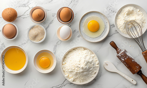 white marble kitchen counter with baking tools and ingredients, eggs, flour, oil on the side, white background, top view, culinary activity at home or bakery workshop.