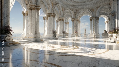 palace, marble, white, interior, column, arch, sunlit, view, gold, decorative, elegant, grand, roomy, balcony, architecture, classical, ancient, luxury, symmetry, ceremony, cerulean, skyline, ocean, horizon, empty, huge, light, bright, ornate, detail, floor, water, pattern, figure, floral, decor, exquisite, tranquil, serene, stunning, digital, rendering, visualisation, art, design