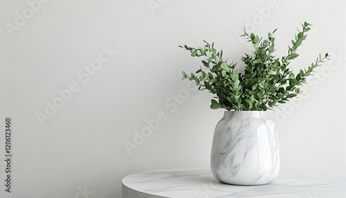 white marble vase with green plants on a matching table, showcasing minimalistic apartment decor -