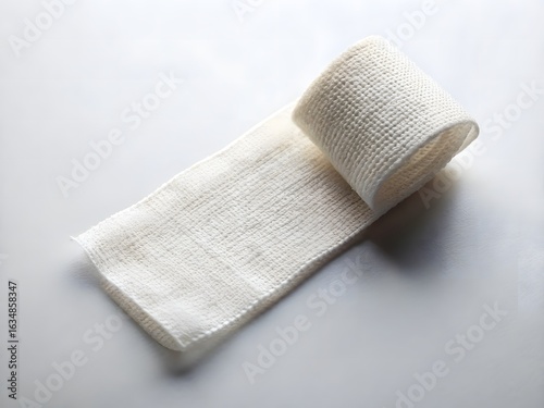 White medical bandage partially unrolled on light gray surface with soft texture and diffused lighting