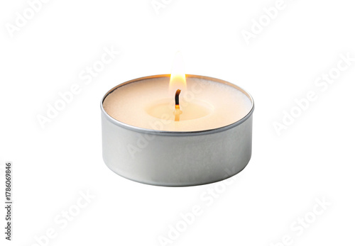 White metal tealight candle, burning bright, cozy atmosphere, simple design, glowing warmly, isolated on a transparent background