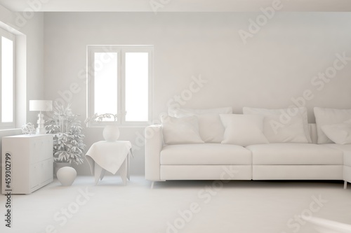White minimalist living room with sofa. Scandinavian interior design. 3D illustration