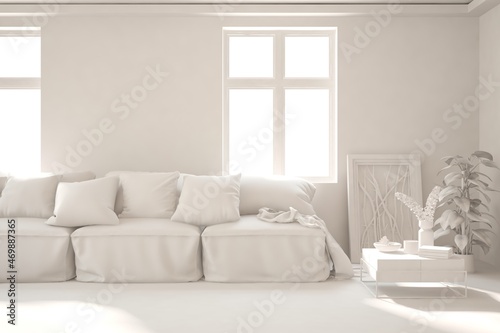 White minimalist living room with sofa. Scandinavian interior design. 3D illustration