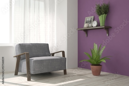 White modern room with armchair. Scandinavian interior design. 3D illustration