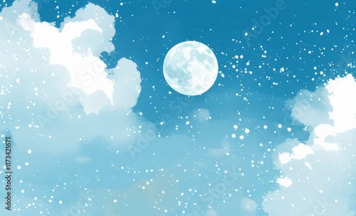 white moon on blue sky with white clouds. painted picture. place for text, congratulations, advertising