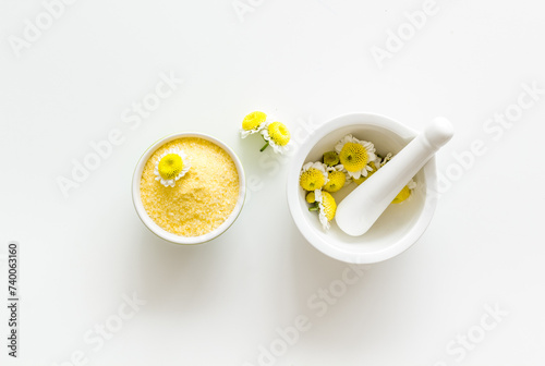 White mortar with pharmacy chamomile flowers for skin care spa products