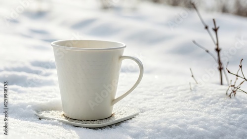 mug, cup, white, snow, winter, cold, outdoors, beverage, porcelain, ceramic, handle, saucer, frost, season, nature, landscape, background, texture, scene, chilly, glacé, ground, surface, tree branch, twig, sunlight, bright, day, still, life, quiet, calm, serene, peaceful